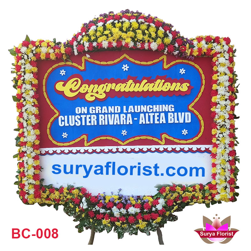 • Karangan Bunga Ucapan Congratulation on Grand Launching Cluster Rivara – Alte BLVD dengan menggunakan karangan bunga Spesial Full Bunga Segar, Rangkaian bunga segar pada styrofoam berukuran 150 x 200 cm dengan bunga berkeliling dan ada variasi bagian atas dan bawahnya, serta model desain dominan warna Biru, Merah dan kuning dan putih.
