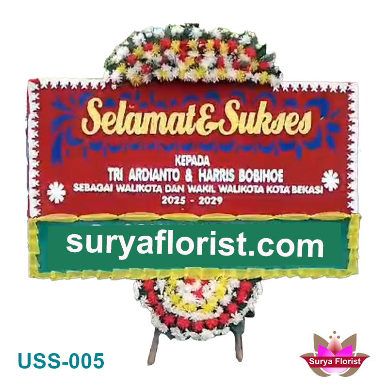 Semoga dengan kepemimpinan beliau berdua Kota Bekasi menjadi kota yang semakin mensejahterakan warganya, tertib dalam berbagai bidang, dan tentu murah senyum dalam keseharian. Tidak lupa dengan kepemimpinan beliau menjadi tambah tentram, tambah ilmu kerohanian yang semakin meningkatkan keimanan dan juga kerukunan sesama masyarakat kota Bekasi. Aamiin. Anda juga bisa memanfaatkan layanan surya florist dalam hal pembuatan dan pengiriman karangan bunga papan yang akan kami kirimkan kemanapun sesuai permintaan anda. Buktikan sendiri, pilih produknya, lalu pilih pesan melalui WA, maka akan langsung tersambung ke nomor Pak Surya yang merupakan owner dari Surya Florist. Pada Kesempatan ini pula, Surya Florist mengucapkan Selamat Menjalankan Tugas Negara Bapak Sukses Selalu menyertai Bapak Berdua dalam menjalankan amanah memimpin Kota Bekasi yang indah. Aamiin.